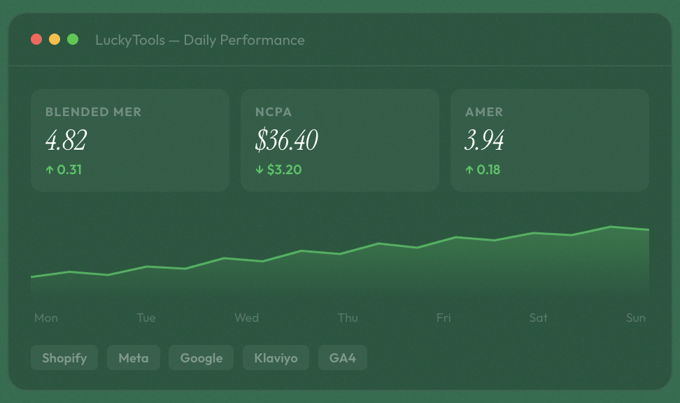 Most agencies report from Meta's dashboard. The problem: Meta only sees what Meta tracks. LuckyTools unifies your Shopify, Meta, Google, Klaviyo, and GA4 data into a single view updated every morning, so every decision is based on what actually happened to your business, not what one platform claims.